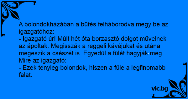 - Igazgató úr! Múlt hét óta borzasztó dolgot művelnek az ápoltak. Megisszák a reggeli kávéjukat és utána megeszik a csészét is. Egyedül a fülét hagyják meg. Mire az igazgató:
