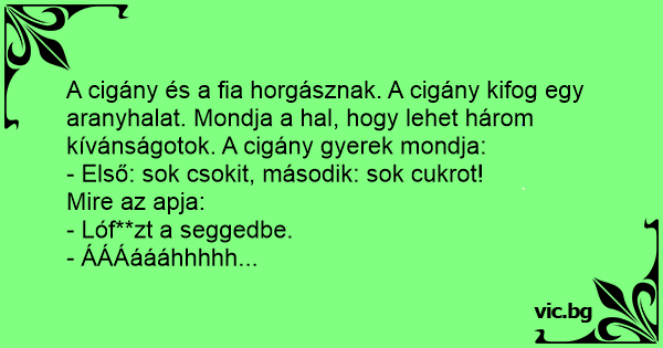 A cigány és a fia horgásznak. A cigány kifog egy aranyhalat. Mondja a hal, hogy lehet három kívánságotok. A cigány gyerek mondja: