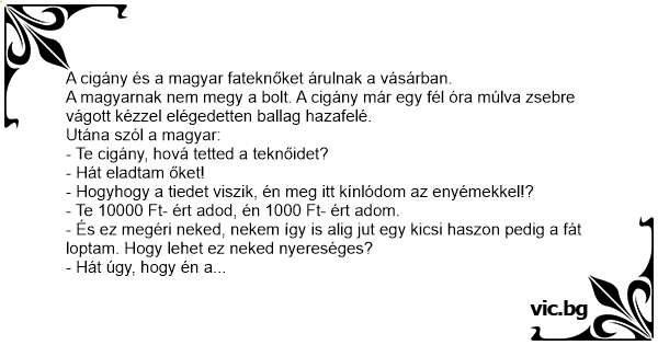A magyarnak nem megy a bolt. A cigány már egy fél óra múlva zsebre vágott kézzel elégedetten ballag hazafelé.