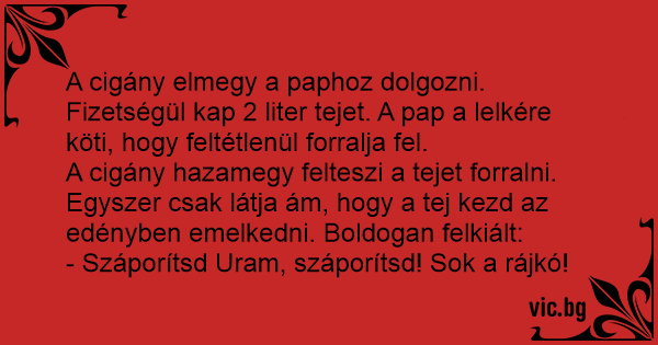 A cigány elmegy a paphoz dolgozni. Fizetségül kap 2 liter tejet. A pap a lelkére köti, hogy feltétlenül forralja fel.