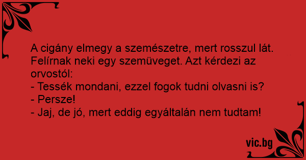 A cigány elmegy a szemészetre, mert rosszul lát. Felírnak neki egy szemüveget. Azt kérdezi az orvostól: