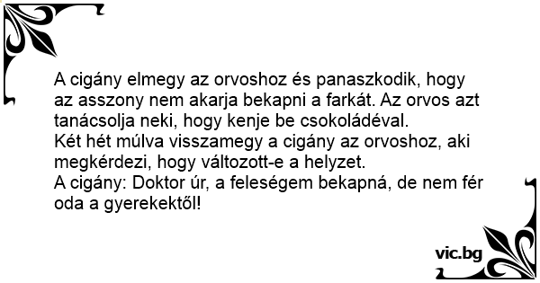 A cigány elmegy az orvoshoz és panaszkodik, hogy az asszony nem akarja bekapni a farkát. Az orvos azt tanácsolja neki, hogy kenje be csokoládéval.