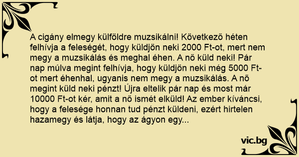 A cigány elmegy külföldre muzsikálni! Következő héten felhívja a feleségét, hogy küldjön neki 2000 Ft-ot, mert nem megy a muzsikálás és meghal éhen. A nő küld neki! Pár nap múlva megint felhívja, hogy küldjön neki még 5000 Ft-ot mert éhenhal, ugyanis nem megy a muzsikálás. A nő megint küld neki pénzt! Újra eltelik pár nap és most már 10000 Ft-ot kér, amit a nő ismét elküld! Az ember kíváncsi, hogy a felesége honnan tud pénzt küldeni, ezért hirtelen hazamegy és látja, hogy az ágyon egy meztelen férfi alszik! Odamegy a feleségéhez és azt kérdezi tőle: