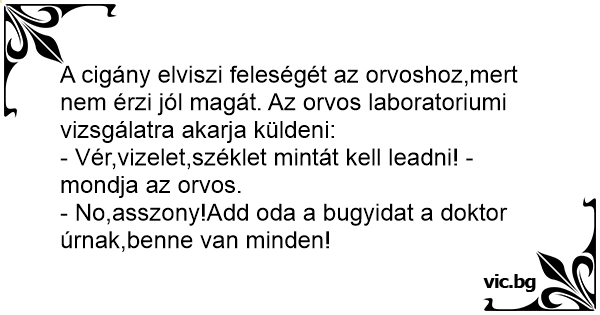 A cigány elviszi feleségét az orvoshoz,mert nem érzi jól magát. Az orvos laboratoriumi vizsgálatra akarja küldeni: