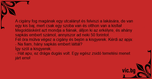 A cigány fog magának egy utcalányt és felviszi a lakására, de van egy kis baj, mert csak egy szoba van és otthon van a kisfia! Megoldásként azt mondja a fiának, álljon ki az erkélyre, és ahány sapkás embert számol, annyiszor ad neki 50 forintot.