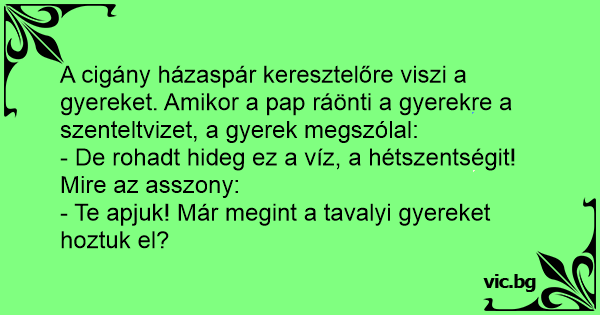 A cigány házaspár keresztelőre viszi a gyereket. Amikor a pap ráönti a gyerekre a szenteltvizet, a gyerek megszólal: