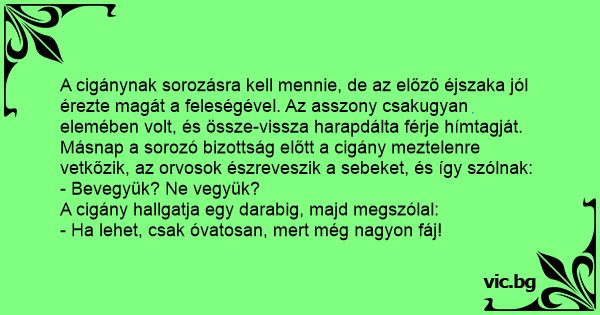 A cigánynak sorozásra kell mennie, de az előző éjszaka jól érezte magát a feleségével. Az asszony csakugyan elemében volt, és össze-vissza harapdálta férje hímtagját. Másnap a sorozó bizottság előtt a cigány meztelenre vetkőzik, az orvosok észreveszik a sebeket, és így szólnak: