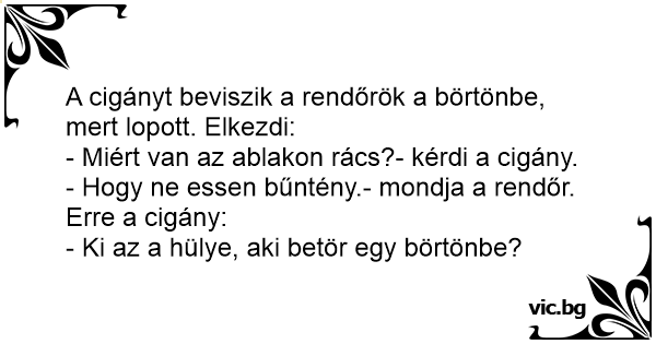 A cigányt beviszik a rendőrök a börtönbe, mert lopott. Elkezdi: - Miért van az ablakon rács?- kérdi a cigány. - Hogy ne essen bűntény.- mondja a rendőr. Erre a cigány: - Ki az a hülye, aki betör egy börtönbe?