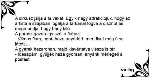 A cirkusz járja a falvakat. Egyik nagy attrakciójuk, hogy az artista a szájában lógatja a farkánál fogva a disznót és megmondja, hogy hány kiló.