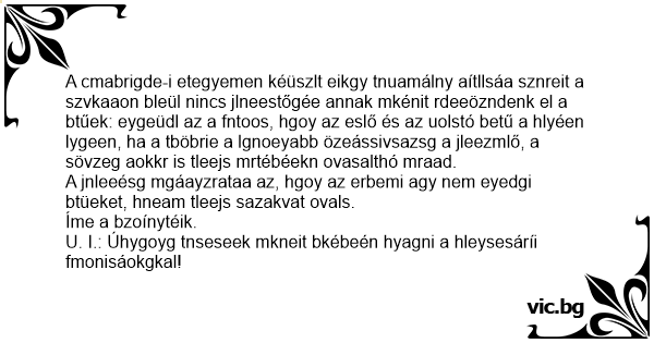 A cmabrigde-i etegyemen kéüszlt eikgy tnuamálny aítllsáa sznreit a szvkaaon bleül nincs jlneestőgée annak mkénit rdeeözndenk el a btűek: eygeüdl az a fntoos, hgoy az eslő és az uolstó betű a hlyéen lygeen, ha a tböbrie a lgnoeyabb özeássivsazsg a jleezmlő, a sövzeg aokkr is tleejs mrtébéekn ovasalthó mraad.