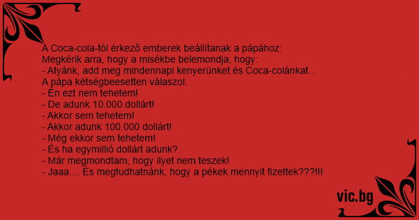 A Coca-Cola cég ügynöke bemegy a pápához, és megkérdi tőle: - Atyám, nem lehetne a Mi Atyánkban a "mindennapi kenyerünket add meg nekünk ma" szöveget mindennapi Coca-Colánkra változtatni? Ajánlunk...