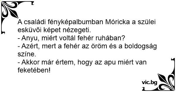 Мамо, мамо, а зошто… Wedding Dress Το νυφικό Момченце държи снимка на младоженци и разпитва майка си: Απορίες ενός μικρού κοριτσιού Защо в деня на сватбата булката е облечена в бяло? A little boy looks at his mum at a wedding and says, “Mummy, why is the girl dressed all in white?” Una bimba assiste per la prima volta a un matrimonio: a un certo punto chiede alla madre: El niño Bernardino asiste a su primera boda – Al cabo de un rato, le pregunta a su mama: – Mamá, mamá, ¿por qué la novia va vestida de blanco? – Pues… porque este es el día más feliz de su vida. – Ah… y dime, ¿porque el novio va vestido de negro? Na ślubie Jaś pyta się taty: - Tato, dlaczego ta pani jest ubrana na biało? - Bo jest szczęśliwa, synku. - Tatusiu, a dlaczego ten pan jest ubrany na czarno? Toto passe devant une église avec sa maman, voyant sortir des jeunes mariés, il demande : - Maman, pourquoi la mariée est-elle en blanc ? - Parce que c'est le plus beau jour de sa vie ! - Et le monsieur alors, pourquoi est-il en noir ? W kościele za chwilę ma się odbyć ślub. Młoda para zbliża się powoli do ołtarza. Wśród zebranych gości jest mała dziewczynka, która pyta mamę: - A dlaczego panna młoda jest tak ślicznie ubrana w... No meio de uma cerimônia de casamento, Joãozinho pergunta: — Mamãe! Por que toda noiva se veste de branco? — Porque é o dia mais feliz da vida dela! — responde a mãe. — Entendi... E por que o noivo... Öğretmen derste şunları anlatıyordu: - Düğünlerde gelinler neden beyaz giyer bilir misiniz? Bu onların en mutlu günü olduğu için! Arka sıralardan bir ses yükselir; - Damatların neden siyah elbise... A little boy, at a wedding looks at his mom and says, “Mommy, why does the girl wear white?” His mom replies, “The bride is in white because she’s happy and this is the happiest day of her life.”... Juhani oli äidin kanssa häissä. Vihkiseremonian jälkeen hän kysyi: Äiti, miksi tädillä on valkea mekko? Koska hän on niin iloinen tänään, äiti vastasi. Juhani mietiskeli hetken ja kysyi sitten:... Anne küçük kızına anlatıyordu. "Bak kızım, gelinler en mutlu günleri olduğu için nikahta beyaz giyerler." Küçük kız bir an düşündü. "Yaa... Şimdi damatların neden siyah giydiklerini daha iyi... Estaba una señora con su hijito de cinco años en la boda de su sobrina cuando el niño levanta la cabeza y le pregunta: Mami, mami, ¿Por qué la novia esta vestida toda de blanco? A lo que la mamá le... - Mamico, de ce poarta miresele rochii albe? - Fiindca exprima bucuria. - Atunci, mirele de ce-i imbracat in negru? Una bambina alla madre nel giorno di un matrimonio: "Mamma perchè la sposa ha il vestito bianco?" E la mamma: "Perchè questo è un giorno felice e importante!" E la bambina: "E perchè lo sposo è... Lilla Elsa är på bröllop för första gången i sitt liv och frågar sin mamma varför bruden är klädd i vitt. - Jo, förstår du lilla Elsa, det är för att det är den lyckligaste dagen i hennes liv. Elsa... - Mamá, ¿por qué las mujeres se visten de blanco en las bodas? - Porque es el día más feliz de su vida. - Ah, ya se porque los hombres se visten de negro. Un enfant et sa mère passent devant une église. Un mariage s'y passe. L'enfant demande à sa mère: - Maman, pourquoi la mariée est habillée en blanc ? - Car le blanc symbolise la joie et c'est le... - Mamo, dlaczego na zdjęciu ślubnym jesteś w białym welonie?- zapytał Jasiu. - Biały kolor to znak radości, synku. - A dlaczego tata jest ubrany na czarno? - Mor? Hvorfor har bruden en hvit kjole på? Moren: - Fordi hvitt symboliserer lykke, og bryllupsdagen er den lykkeligste dagen i hennes liv. Piken: - Jammen, hvorfor har brudgommen da sort på? Мамо, ги гледав сликите од вашата свадба со тато и сакам да те прашам зошто носиш бел фустан? Мајката: Зошто белата боја е боја на радоста. Детето: А тогаш зошто тато е во црно?! 1 mère et 1 fils parle: Fils: Maman pourquoi la mariée porte une robe blanche le jour du mariage? Mère: Car c'est le plus beau jour de sa vie. Fils: Alors pourquoi le marié est habillé en noir? Toto et ses parents assistent à un mariage. Toto demande à sa maman : - Pourquoi la mariée à une robe blanche ? - Car c’est le jour le plus magnifique de sa vie, répond sa mère. - Alors pourquoi le... *boy whispers to his mom during a wedding* Boy: "Mommy?" Mom: "What?" Boy: "Why is the girl dressed in white?" Mom: "Because this is the happiest day of her life." Boy: "... so why is the boy... Attending a wedding for the first time, a little girl whispered to her mother, "why is the bride dressed in white?" "Because white is the color of happiness," her mother explained. "And today is... Mergaičiukė pirmą kartą vestuvėse: - Mama, o kodėl šita…jaunoji… visa baltai apsirengusi? - Todėl, kad šiandien pati džiugiausia diena jos gyvenime. Po pauzės: - Mama, o kodėl jaunasis apsirengęs...