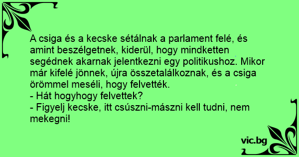 A csiga és a kecske sétálnak a parlament felé, és amint beszélgetnek, kiderül, hogy mindketten segédnek akarnak jelentkezni egy politikushoz. Mikor már kifelé jönnek, újra összetalálkoznak, és a csiga örömmel meséli, hogy felvették.
