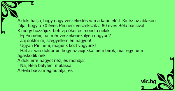 A doki hallja, hogy nagy veszekedés van a kapu előtt. Kinéz az ablakon látja, hogy a 70 éves Piri néni veszekszik a 80 éves Béla bácsival. Kimegy hozzájuk, behívja őket és mondja nekik: