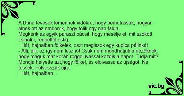 - Állj, állj, ez így nem lesz jó! Csak nem mondhatjuk a nézőknek, hogy maguk már korán reggel ivással kezdik a napot. Tudja mit? Mondja helyette azt,hogy fölkel, és elolvassa az újságot. Na, tessék. Fölvesszük újra.