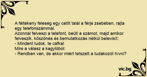 A féltékeny feleség egy cetlit talál a férje zsebében, rajta egy telefonszámmal.