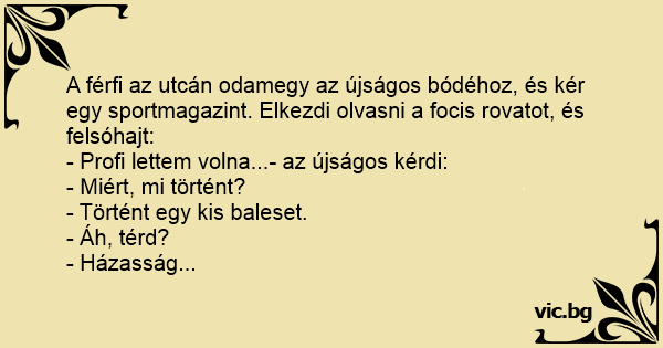 A férfi az utcán odamegy az újságos bódéhoz, és kér egy sportmagazint. Elkezdi olvasni a focis rovatot, és felsóhajt: