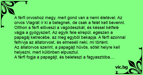 A férfi orvoshoz megy, mert gond van a nemi életével. Az orvos Viagrát ír ki a betegnek, de csak a felét kell bevenni. Otthon a férfi előveszi a vágódeszkát, és késsel kétfelé vágja a gyógyszert. Az egyik fele elrepül, egészen a papagáj ketrecébe, az meg egyből bekapja. A férfi azonnal felhívja az állatorvost, és elmeséli neki, mi történt.