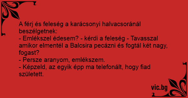 - Emlékszel édesem? - kérdi a feleség - Tavasszal amikor elmentél a Balcsira pecázni és fogtál két nagy, fogast?