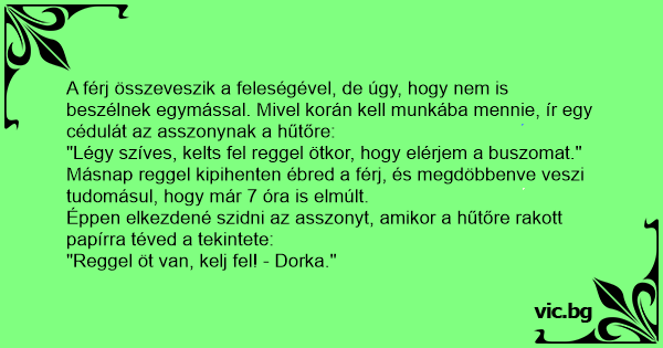 Másnap reggel kipihenten ébred a férj, és megdöbbenve veszi tudomásul, hogy már 7 óra is elmúlt.