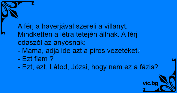 A férj a haverjával szereli a villanyt. Mindketten a létra tetején állnak. A férj odaszól az anyósnak: