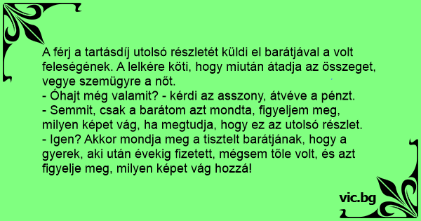 - Igen? Akkor mondja meg a tisztelt barátjának, hogy a gyerek, aki után évekig fizetett, mégsem tőle volt, és azt figyelje meg, milyen képet vág hozzá!