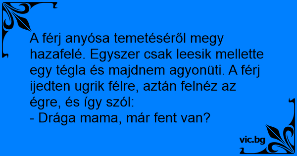 Eina vyras iš uošvės laidotuvių. Prieina prie traukinio, o čia plyta iš viršaus krenta, vos spėjo atsitraukti. Vyras pakelia galvą į dangų ir taria: - Ar jūs jau ten mama?