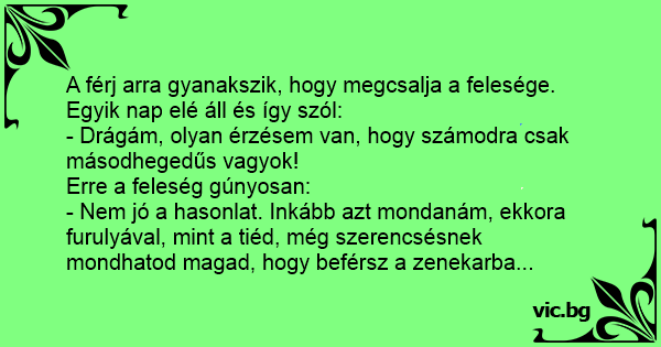 Der Mann brüllt seine Frau an: "Ich habe es satt, bei dir immer nur die zweite Geige zu spielen!" Ehefrau: "Sei froh, dass du überhaupt noch im Orchester bist!" Két pasi beszélget egy hölgyről, aki mindenkinek tetszik. - Igazán gyönyörű nő, de egy kicsit forró a vére. Nem lepődnék meg, ha a férje csak másodhegedűs lenne nála. - Másodhegedűs? Szerintem... - Iubito, m-am săturat să tot fiu "vioara a doua" pe lângă tine! - Bucură-te că mai faci parte din orchestră... Mīļākais pukojas: - Viss, pietiek! Man ir apnicis spēlēt otro vijoli! Viņa: - Pat nesāc! Priecājies, ka vispār vēl esi orķestrī! Husband suspects his wife is cheating and tactfully asks: Honey I think im playing second fiddle ? Wife: With a flute like yours you are lucky to be in the band. - Nagyon szép asszony a Géza felesége, de szerintem egy kicsit könnyűvérű... Nem lepődnék meg, ha a férje csak a másodhegedűs szerepét játszaná otthon. - Másodhegedűs? Viccelsz?!Szerintem már az is... Meilužis barasi su moterimi: - Tu vis kalbi ir kalbi apie savo vyrą. Man nusibodo vis būti antruoju smuiku! - Džiaukis, kad iš viso esi orkestre! Meilužė burba lovoje: - Klausyk, man taip nepatinka… Kodėl aš turiu griežti „antru smuiku“ ?! - Ačiū sakyk, kad iš viso esi orkestre. Žmona įtaria, kad vyras jai neištikimas. Ir štai kartą jis pareina namo su lūpdažių pėdsaku ant veido. Žmona pasipiktina: - Petrai, aš niekada nesutiksiu groti antru smuiku! - Antru smuiku?... Der Junge sagt ärgerlich zu seiner Freundin: "Ich habe es endgültig satt, bei dir immer nur die zweite Geige zu spielen!" Darauf fängt sie zu lachen an und meint: "Du kannst froh sein, daß du... Съпругът: - Не искам да съм втора цигулка! Тя: - Ти се радвай, че изобщо си в оркестъра...