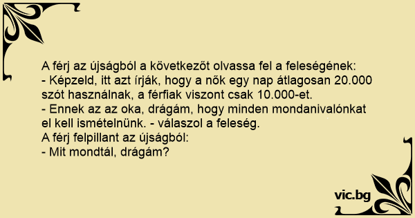 - Képzeld, itt azt írják, hogy a nők egy nap átlagosan 20.000 szót használnak, a férfiak viszont csak 10.000-et.