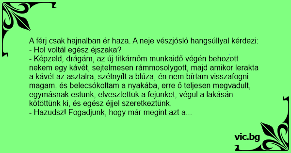 - Képzeld, drágám, az új titkárnőm munkaidő végén behozott nekem egy kávét, sejtelmesen rámmosolygott, majd amikor lerakta a kávét az asztalra, szétnyílt a blúza, én nem bírtam visszafogni magam, és belecsókoltam a nyakába, erre ő teljesen megvadult, egymásnak estünk, elvesztettük a fejünket, végül a lakásán kötöttünk ki, és egész éjjel szeretkeztünk.