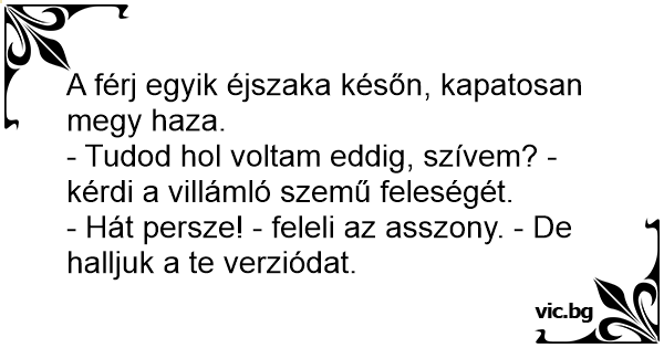 - Tudod hol voltam eddig, szívem? - kérdi a villámló szemű feleségét.