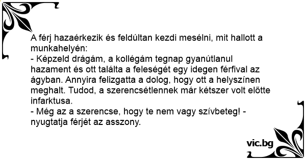 - Képzeld drágám, a kollégám tegnap gyanútlanul hazament és ott találta a feleségét egy idegen férfival az ágyban. Annyira felizgatta a dolog, hogy ott a helyszínen meghalt. Tudod, a szerencsétlennek már kétszer volt előtte infarktusa.