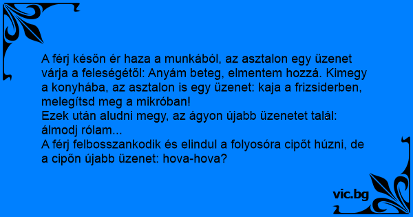 A férj későn ér haza a munkából, az asztalon egy üzenet várja a feleségétől: Anyám beteg, elmentem hozzá. Kimegy a konyhába, az asztalon is egy üzenet: kaja a frizsiderben, melegítsd meg a mikróban!
