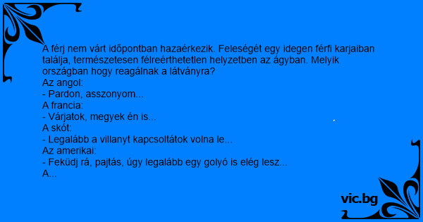 A férj nem várt időpontban hazaérkezik. Feleségét egy idegen férfi karjaiban találja, természetesen félreérthetetlen helyzetben az ágyban. Melyik országban hogy reagálnak a látványra?