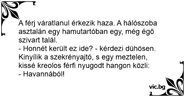A férj váratlanul érkezik haza. A hálószoba asztalán egy hamutartóban egy, még égő szivart talál.