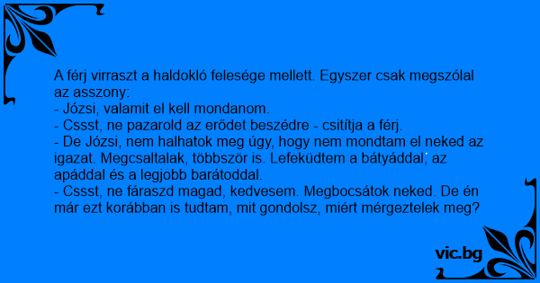 - De Józsi, nem halhatok meg úgy, hogy nem mondtam el neked az igazat. Megcsaltalak, többször is. Lefeküdtem a bátyáddal, az apáddal és a legjobb barátoddal.
