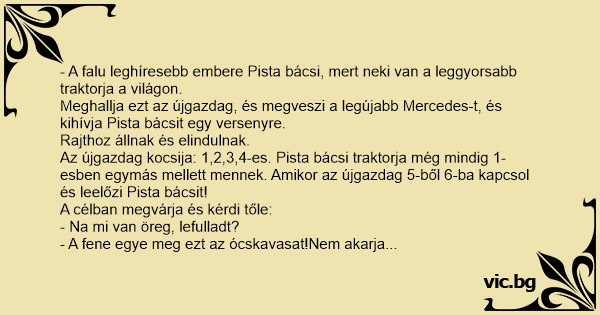 - A falu leghíresebb embere Pista bácsi, mert neki van a leggyorsabb traktorja a világon.