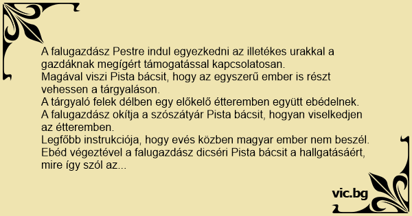 Ebéd végeztével a falugazdász dicséri Pista bácsit a hallgatásáért, mire így szól az öreg: