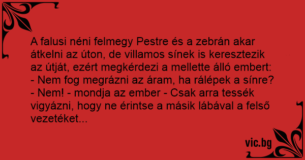 A falusi néni felmegy Pestre és a zebrán akar átkelni az úton, de villamos sínek is keresztezik az útját, ezért megkérdezi a mellette álló embert: