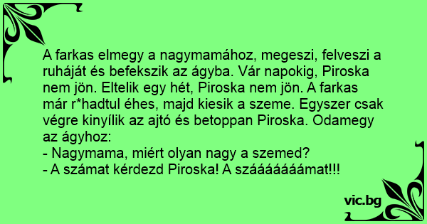 A farkas elmegy a nagymamához, megeszi, felveszi a ruháját és befekszik az ágyba. Vár napokig, Piroska nem jön. Eltelik egy hét, Piroska nem jön. A farkas már r*hadtul éhes, majd kiesik a szeme. Egyszer csak végre kinyílik az ajtó és betoppan Piroska. Odamegy az ágyhoz: