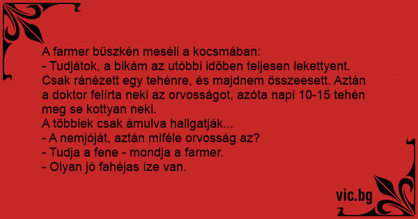 - Tudjátok, a bikám az utóbbi időben teljesen lekettyent. Csak ránézett egy tehénre, és majdnem összeesett. Aztán a doktor felírta neki az orvosságot, azóta napi 10-15 tehén meg se kottyan neki.