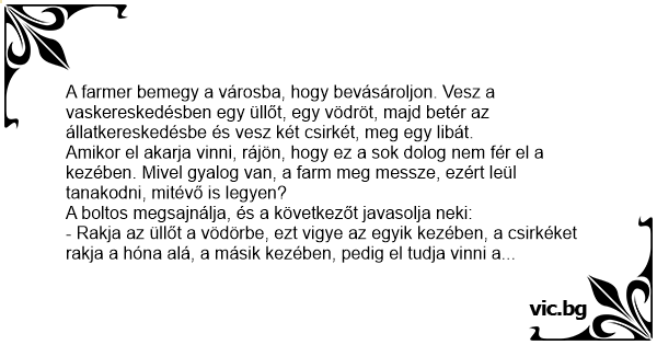 A farmer bemegy a városba, hogy bevásároljon. Vesz a vaskereskedésben egy üllőt, egy vödröt, majd betér az állatkereskedésbe és vesz két csirkét, meg egy libát.