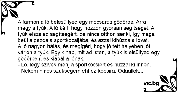 A ló nagyon hálás, és megígéri, hogy jó tett helyében jót várjon a tyúk. Egyik nap, mit ad isten, a tyúk is elsüllyed egy gödörben, és kiabál a lónak.