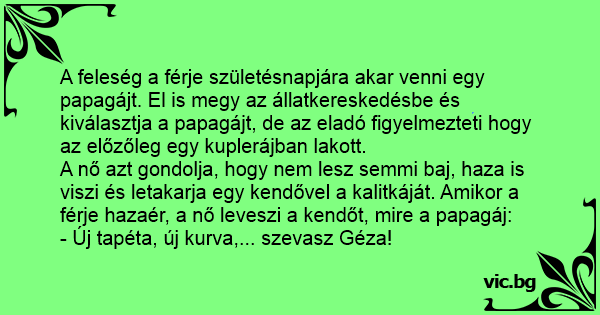 A feleség a férje születésnapjára akar venni egy papagájt. El is megy az állatkereskedésbe és kiválasztja a papagájt, de az eladó figyelmezteti hogy az előzőleg egy kuplerájban lakott.