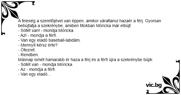 A feleség a szeretőjével van éppen, amikor váratlanul hazaér a férj. Gyorsan bebújtatja a szekrénybe, amiben titokban Móricka már elbújt: