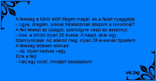 - Ugye, drágám, sokkal fiatalabbnak látszom a koromnál?