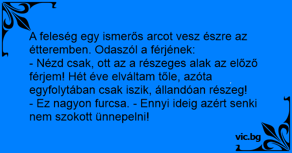 - Nézd csak, ott az a részeges alak az előző férjem! Hét éve elváltam tőle, azóta egyfolytában csak iszik, állandóan részeg!