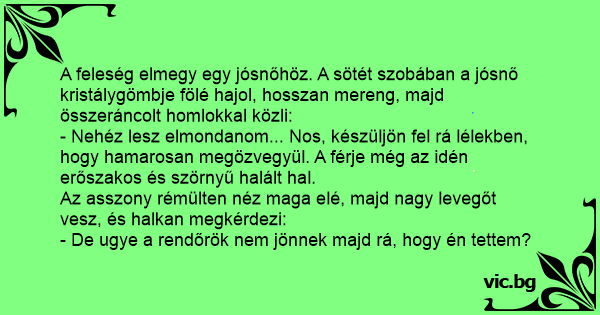 A feleség elmegy egy jósnőhöz. A sötét szobában a jósnő kristálygömbje fölé hajol, hosszan mereng, majd összeráncolt homlokkal közli: - Nehéz lesz elmondanom... Nos, készüljön fel rá lélekben, hogy hamarosan megözvegyül. A férje még az idén erőszakos és szörnyű halált hal. Az asszony rémülten néz maga elé, majd nagy levegőt vesz, és halkan megkérdezi: - De ugye a rendőrök nem jönnek majd rá, hogy én tettem?