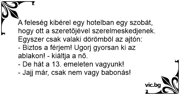 - Biztos a férjem! Ugorj gyorsan ki az ablakon! - kiáltja a nő.