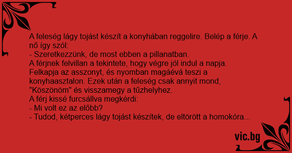 A feleség lágy tojást készít a konyhában reggelire. Belép a férje. A nő így szól: